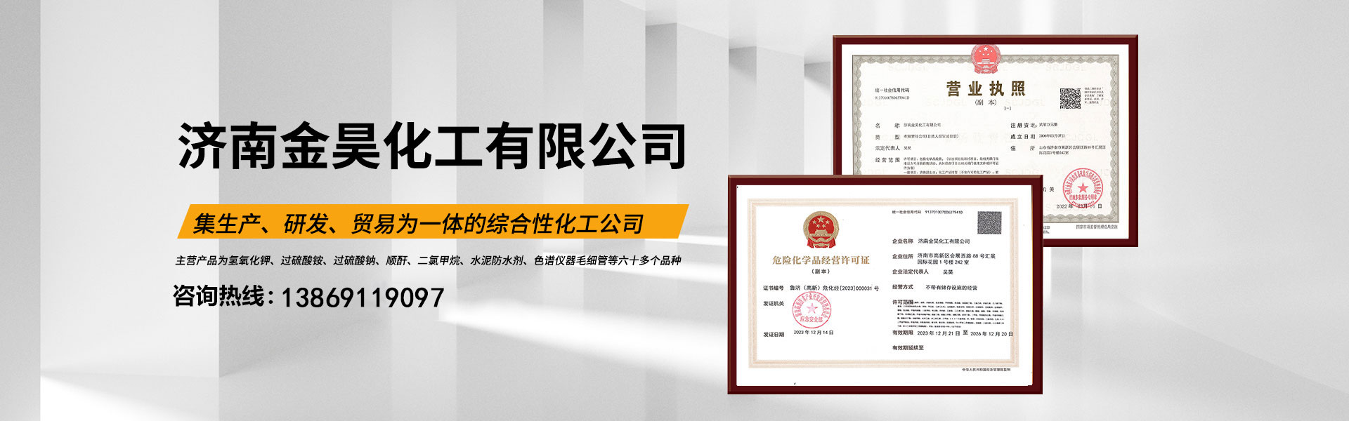 我公司是一家集、研发、贸易为一体的综合性化工公司。主要涵盖无机化工产品、化工产品、实验仪器等几大系列。主营产品为氢氧化钾、过硫酸铵、过硫酸钠、顺酐、二氯甲烷、水泥防水剂、色谱仪器毛细管等六十多个品种。产品主要用于农药、农肥、水处理、制药、造纸、冶金、建筑添加剂、橡胶制造等多个领域。 岁月不居,时节如流。公司于2006年成立,如今已十几个年头了。一路走来我们一步一个脚印,兢兢业业,诚信经营,如今公司已发展成为年销售额近陆仟万元...
